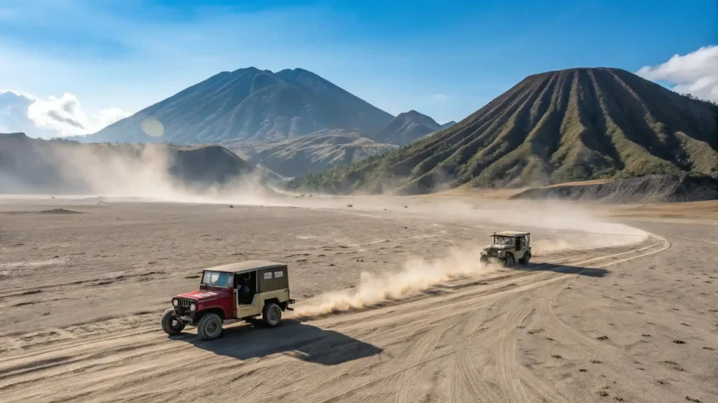 Lautan Pasir Bromo punya area yang super luas, jadi pengalamanmu nggak bakal kayak muter-muter doang. Kamu bisa ngerasain jeep nge-drift ringan di atas pasir atau lewat jalur bergelombang yang bikin badan auto goyang. Satu kata: nagih.
